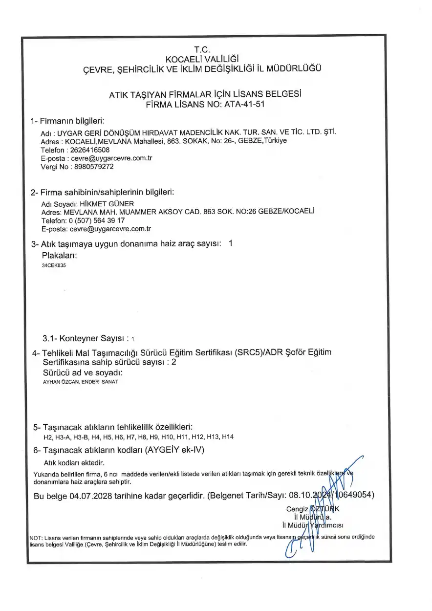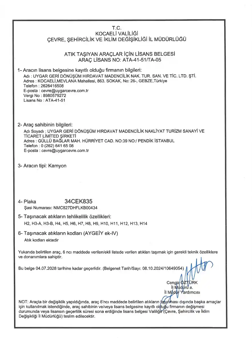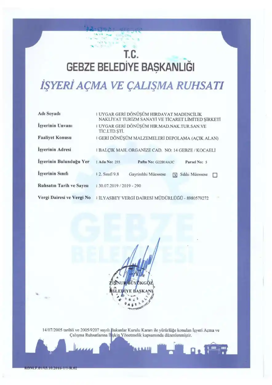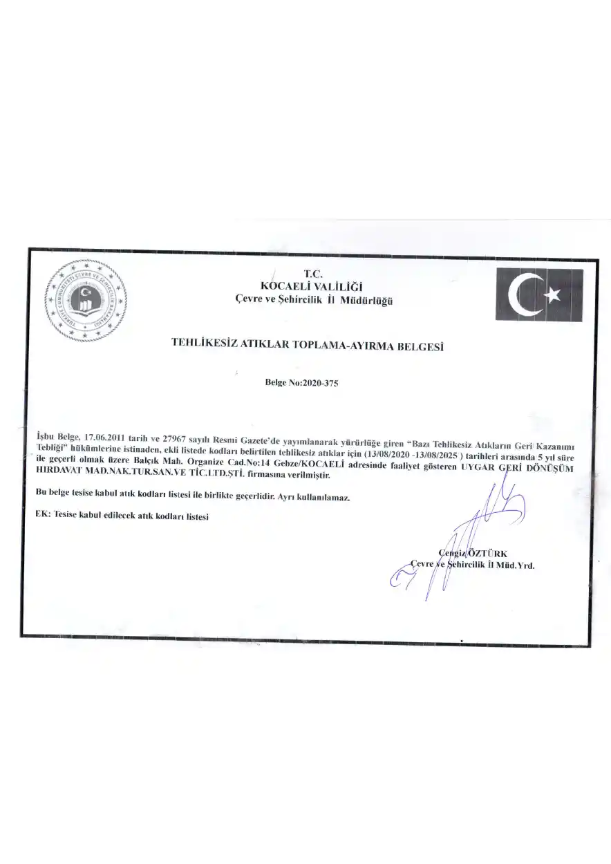 Uygar Geri Dönüşüm olarak, çevreye duyarlı ve sürdürülebilir çözümler sunduğumuzu kalite ve çevre yönetim sertifikalarımızla kanıtlıyoruz. Standartlara uygun, güvenilir hizmet sunuyoruz.